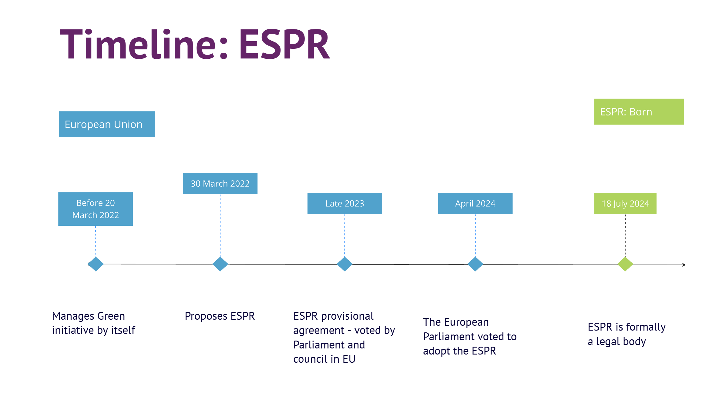 ESPR (Ecodesign for Sustainable Products Regulation) was proposed as a legal framework to enforce and monitor the DPP. This was needed as the Circular Economy applies not just to Electronic products but to everything in the EU market.